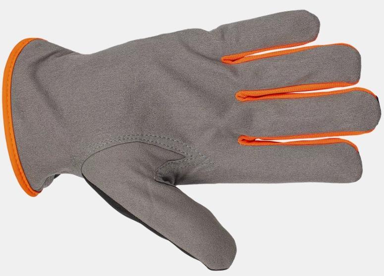 Textilní šitá rukavice vyrobena z polyesteru, dlaň ze syntetické usně, v zápěstí gumka.