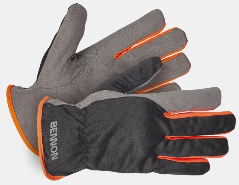 Textilní šitá rukavice vyrobena z polyesteru, dlaň ze syntetické usně, v zápěstí gumka.